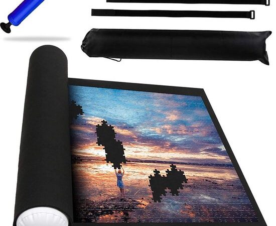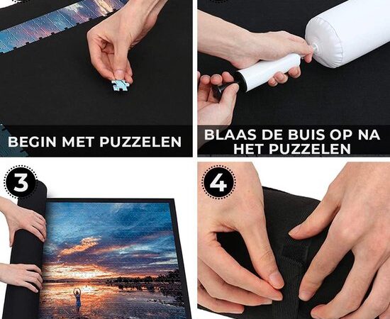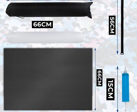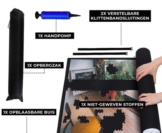 Paketet innehåller en pusselmatta som mäter cirka 117 x 66 cm, ett uppblåsbart rullrör, elastiska monteringsremmar och en kompakt förvaringsbehållare. Med detta set kan du börja pussla direkt och säkert rulla ihop ditt pussel vid behov.